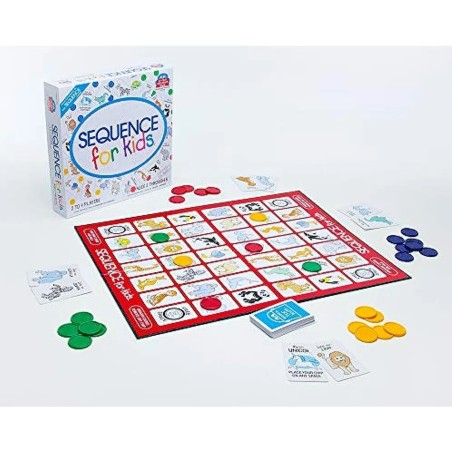 Secuencia es un gran juego para los niños! Pero Sequence es también el emocionante juego de estrategia para todos los amantes de los desafíos. Incluye tablero de juego, cartas de secuencia y 135 fichas de juego.